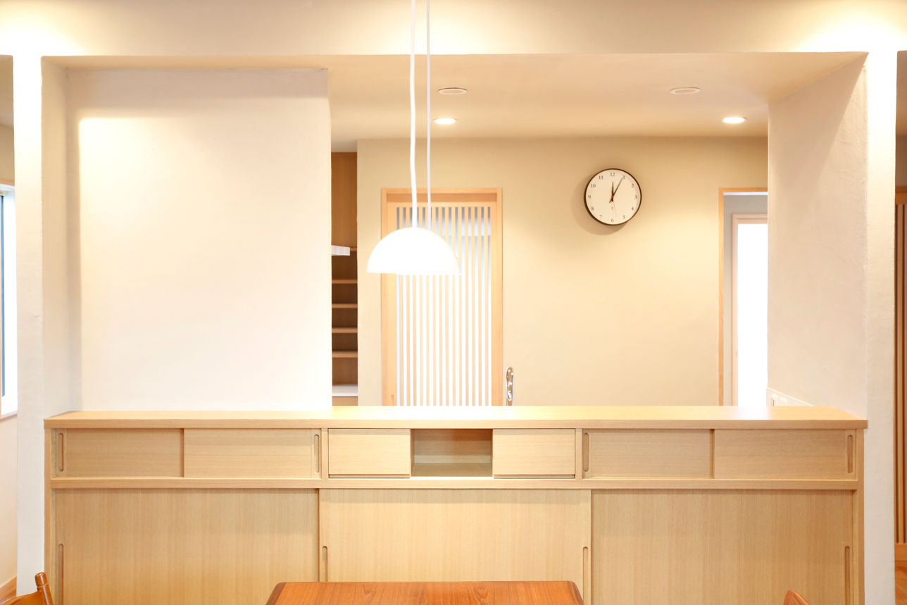 今回、お客さまとたくさんの打合せを行いまして、パントリー・カウンター・作業棚といったキッチン廻りの家具、リビング収納、洗面化粧台、ベッドなど大変多くの家具もデザイン、製作させて頂きました。